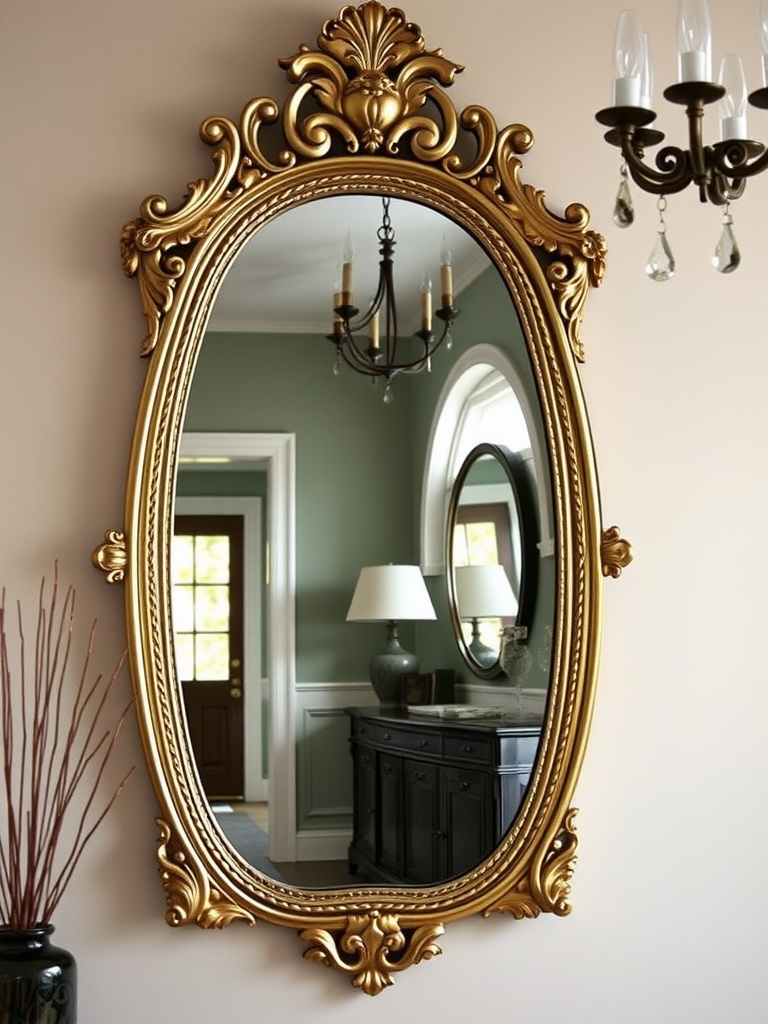 Decorative mirrors can really enhance your space and make it feel more inviting. A beautifully designed mirror, like one with ornate gold detailing, adds a touch of elegance while also reflecting light. Your guests will love how such a simple piece can transform the overall vibe of your home.