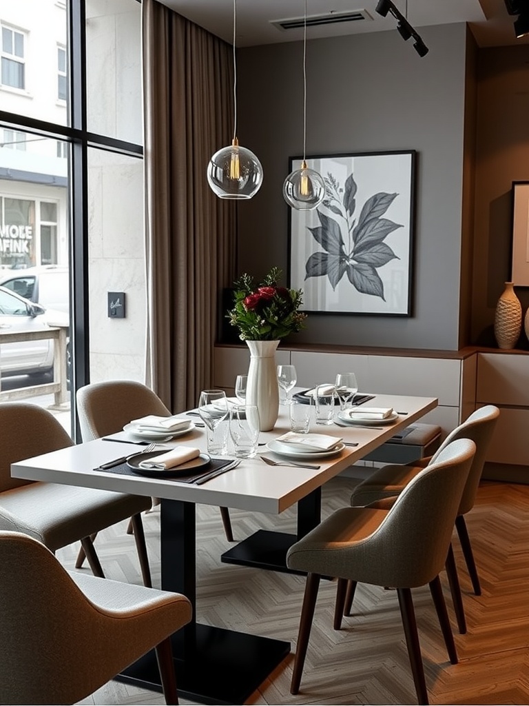 A chic urban minimalism tablescape embraces simplicity and elegance. The clean lines and sleek materials create an inviting atmosphere for both indoor and outdoor dining. Adding a pop of greenery and subtle decor elements can enhance the overall vibe without overwhelming the space.