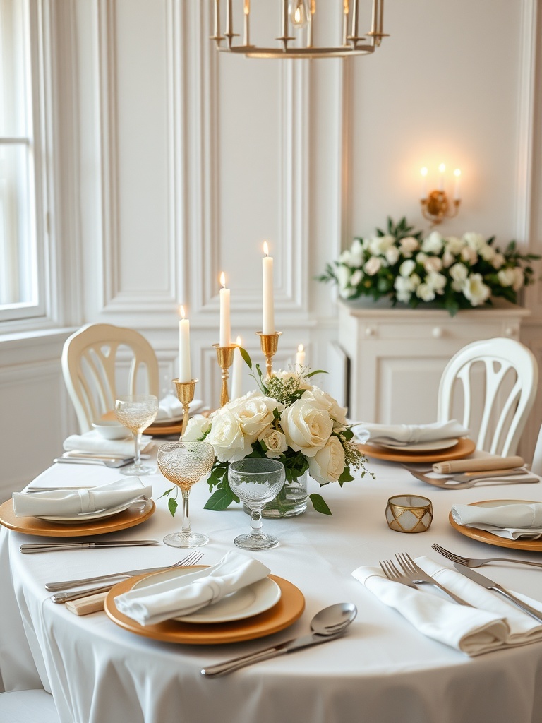 Create a classic white tablescape that oozes elegance for your next gathering. Pair crisp white tableware with golden accents for a chic touch, and don’t forget the soft glow of candles to set the mood. Fresh white roses bring a hint of nature indoors, making it a lovely spot for both casual and formal dining.