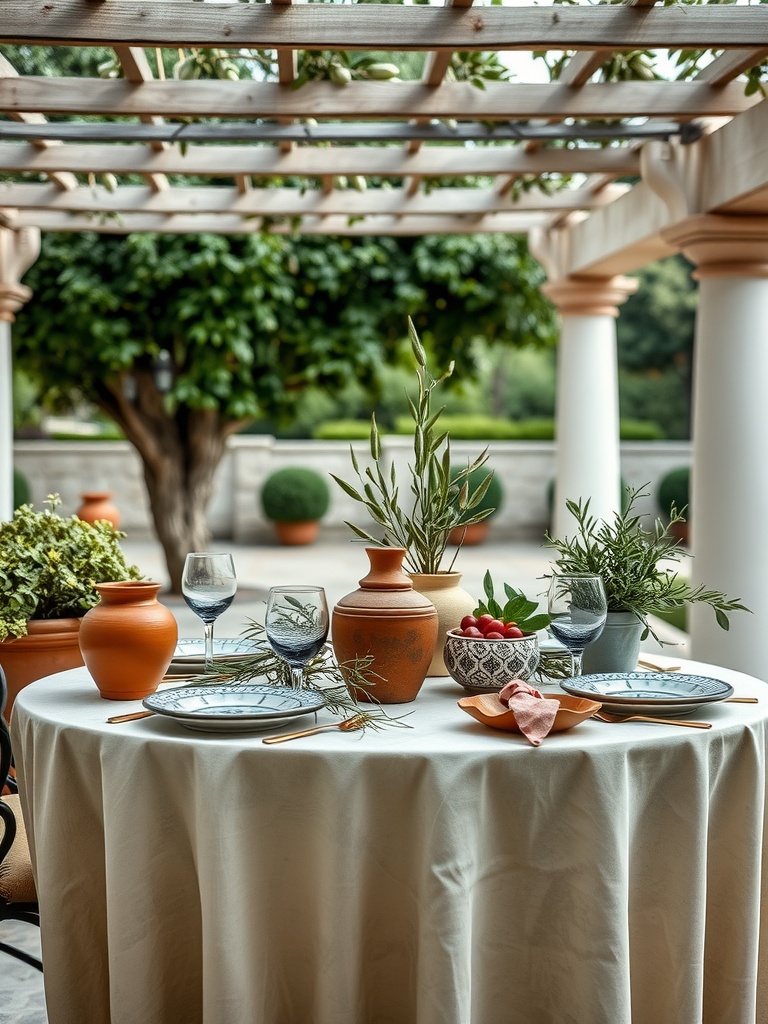 Imagine dining al fresco under a beautiful pergola, surrounded by lush greenery. The table is dressed with earthy pottery and fresh herbs, creating a warm and inviting vibe. Each detail invites you to relax and enjoy a long meal with friends and family, making your summer gatherings feel special.