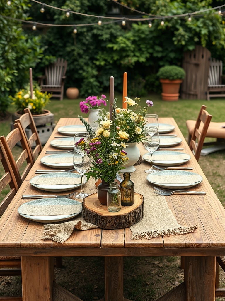This rustic farmhouse tablescape invites a sense of warmth and comfort to any gathering. The wooden table paired with simple, elegant tableware and fresh flowers creates a cozy atmosphere that’s just right for summer dining. String lights above add a magical touch, making it a perfect spot for evening meals with family and friends.