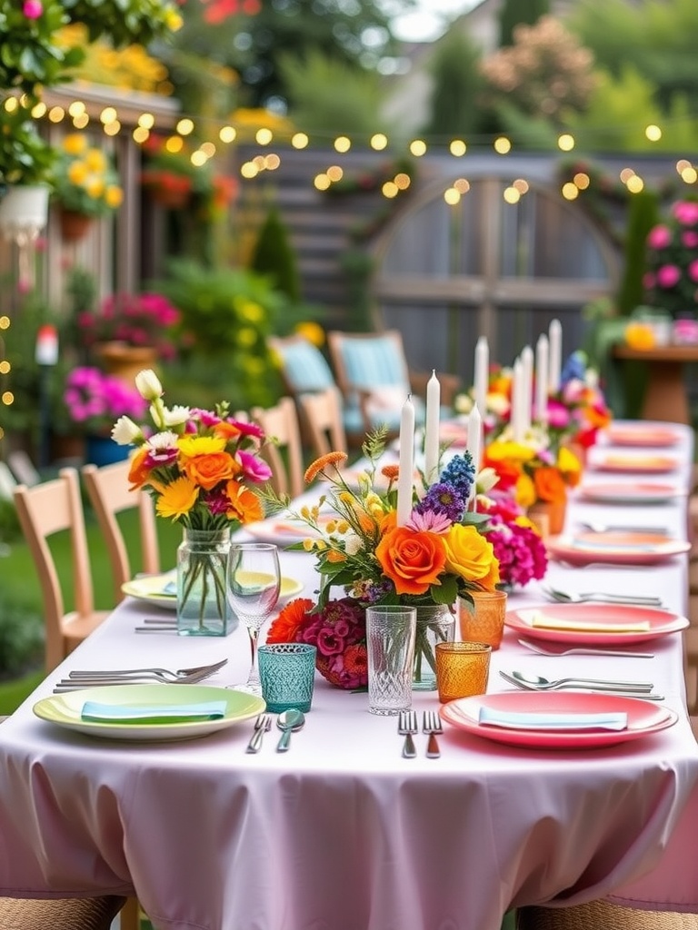 A vibrant garden party setup adds a splash of color to any gathering. With cheerful flowers and bright dishware, this tablescape invites everyone to enjoy the moment. Twinkling lights overhead create a cozy atmosphere perfect for summer dining.