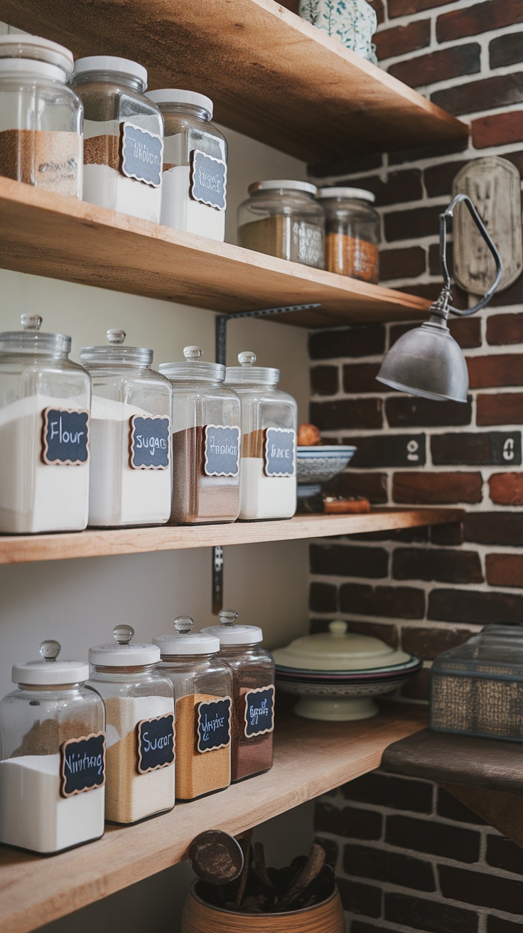 Chalkboard pantry labels are a trendy and practical way to keep your small pantry organized. They add a rustic touch while making it easy to identify contents at a glance. In the image, you can see clear jars filled with various ingredients like flour, sugar, and spices, each labeled neatly with a chalkboard tag.