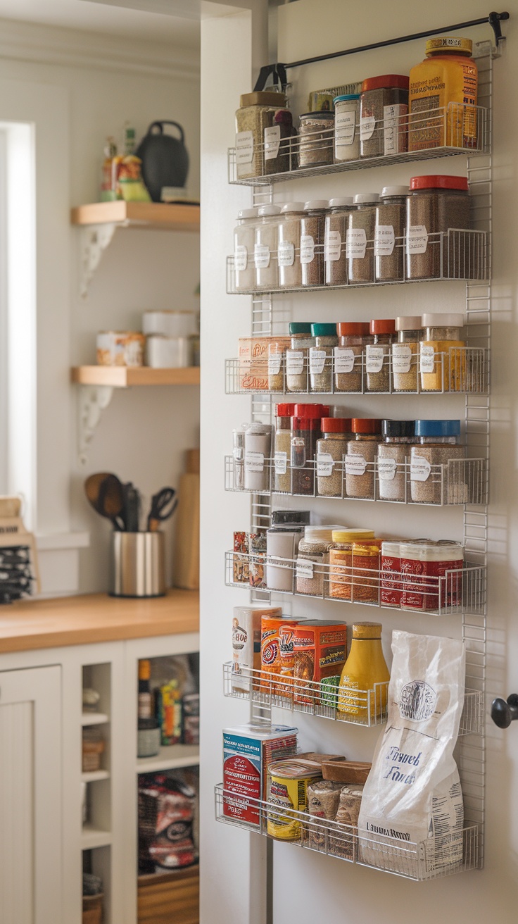 When it comes to tiny kitchen organization, over-the-door storage solutions can make a world of difference. Just look at this image of a well-organized pantry door. The use of wire racks to hold jars and containers optimizes space effectively. This is particularly useful in small pantries where every inch counts.
