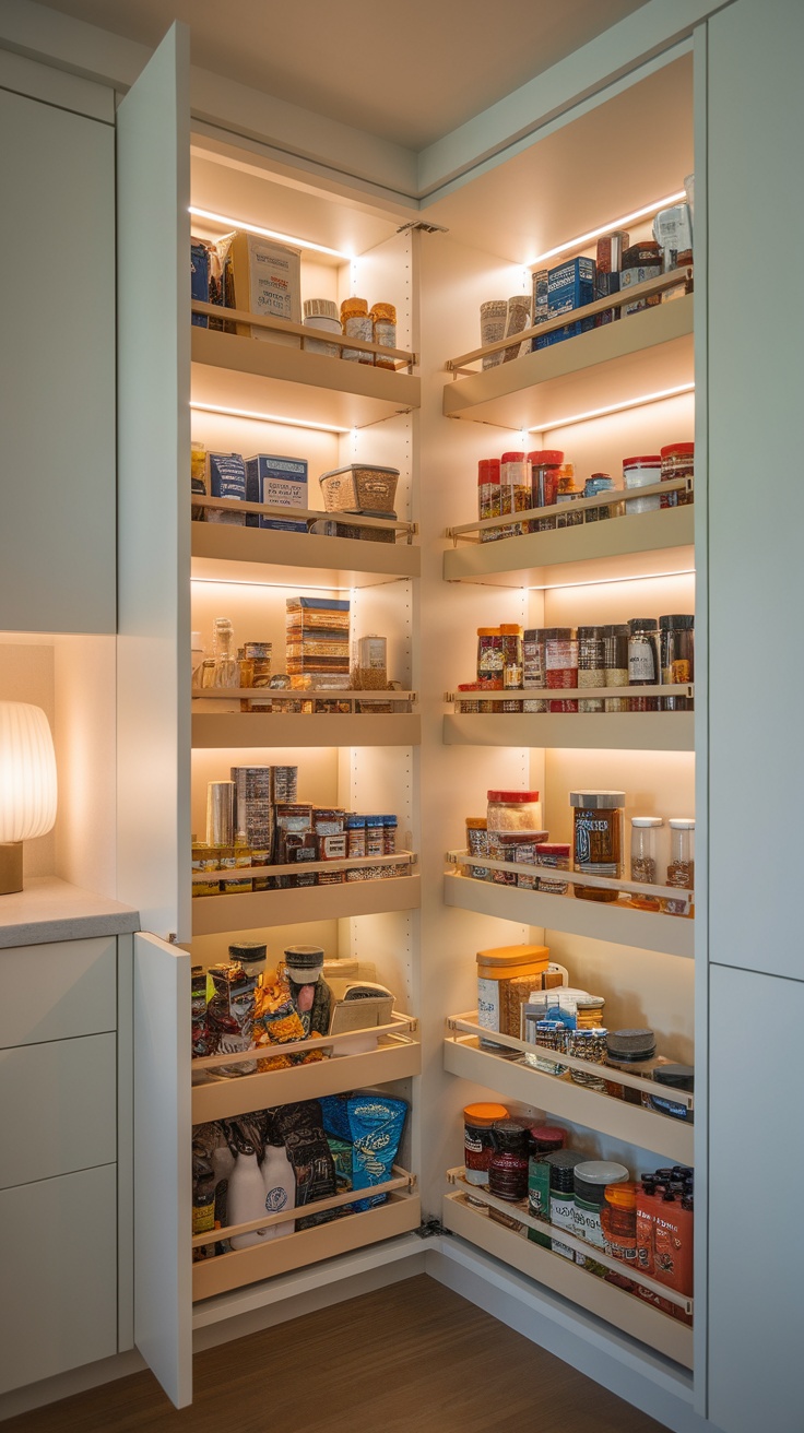 Consider incorporating lighting, as seen in the image, to highlight your organized items. This little touch not only enhances visibility but adds a modern flair to your kitchen storage solutions. Whether you have a small pantry or a larger space, pull-out vertical shelves can elevate your storage game.