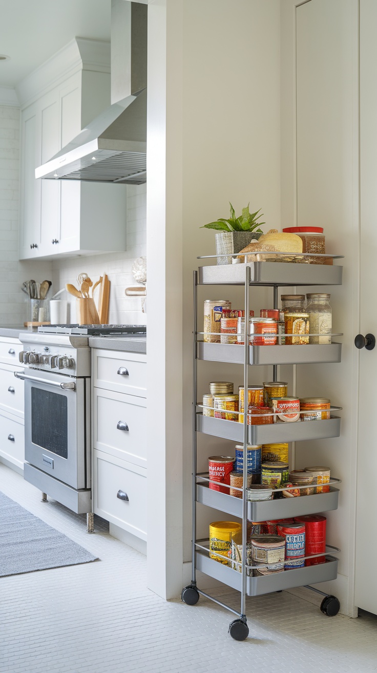In the image, you can see a well-organized rolling cart filled with various jars and cans. The cart’s mobility makes it easy to access items without digging through clutter. This is particularly useful for small pantry ideas, where every inch counts. You can pull it out when you need it and tuck it away when you don’t, making it a great fit for tiny kitchen organization.