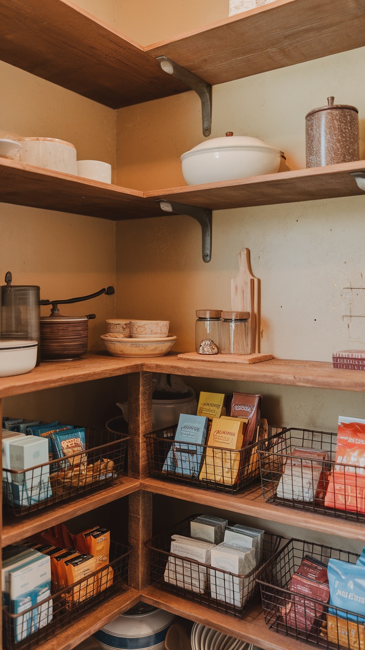 In the image, you can see an organized pantry featuring these baskets filled with various packages. The colorful assortment adds a touch of charm while keeping your pantry tidy. This method is especially helpful in tiny kitchens or small pantries where every inch counts.