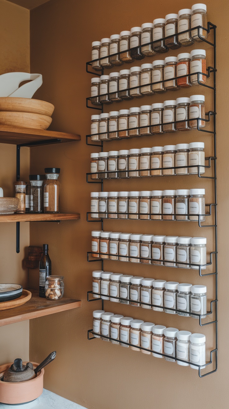 For those exploring compact pantry hacks, a wall-mounted spice rack can help you incorporate more small pantry ideas into your space. You can easily customize the setup to fit your style, whether you prefer a minimalist look or something more vibrant. If you’re in search of kitchen storage solutions that blend functionality with aesthetics, this is definitely one to consider.