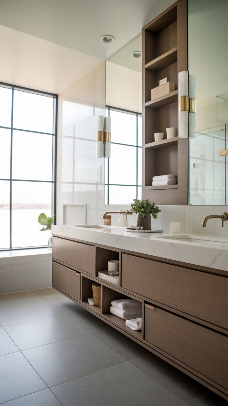 Creating a spa-like retreat in your home is all about the details, and custom vanities and storage solutions play a big role. The image above showcases a sleek vanity that combines style and functionality. The rich, earthy tones of the cabinetry bring warmth to the space, while the clean lines enhance the modern aesthetic.