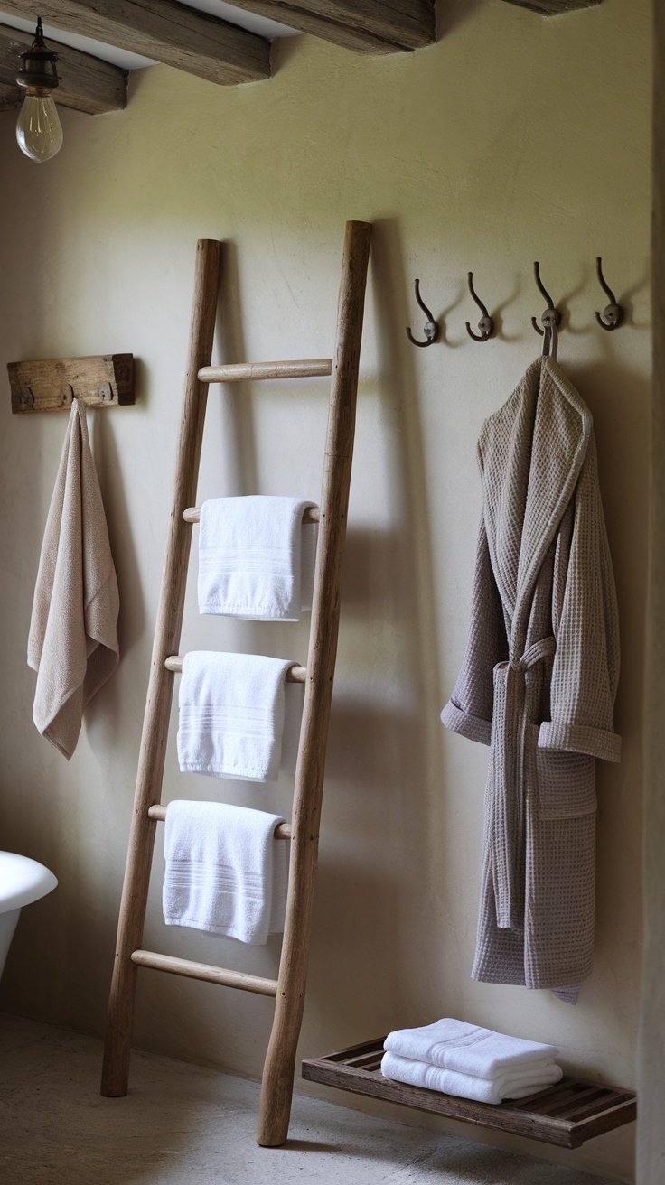 Creating a spa-like atmosphere in your bathroom can be as simple as incorporating plush towels and robes into your decor. In the image, you can see a cozy setup featuring soft, neatly arranged towels on a rustic wooden ladder. This approach not only saves space but also adds a touch of charm to the overall design.