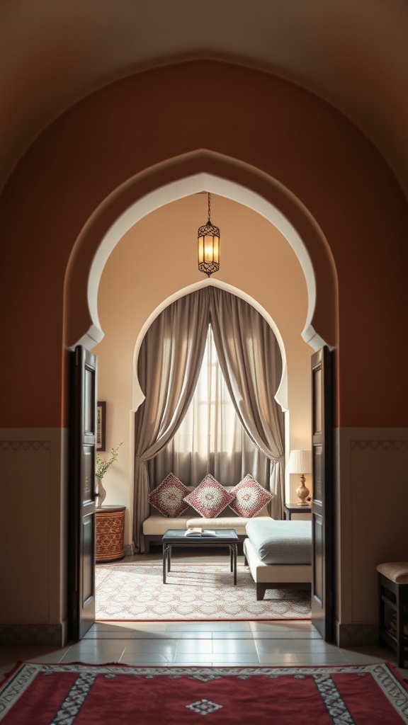 The use of a Moroccan lantern adds a touch of elegance. Lantern decor like this can set the mood in your space, casting beautiful shadows and providing soft illumination. This combination of elements is an excellent example of how arched doorways and thoughtful nook designs can transform any bedroom into a luxurious retreat.