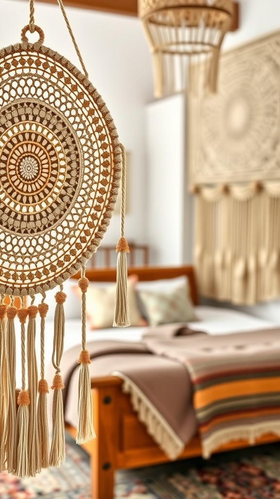 In a bohemian bedroom, wall hangings play a key role in creating that laid-back vibe. The image showcases beautifully crafted macramé wall art, which adds texture and depth to the space. These intricate patterns echo the rich ethnic patterns often found in Moroccan-inspired interiors, bringing a touch of warmth and artistry to your decor.