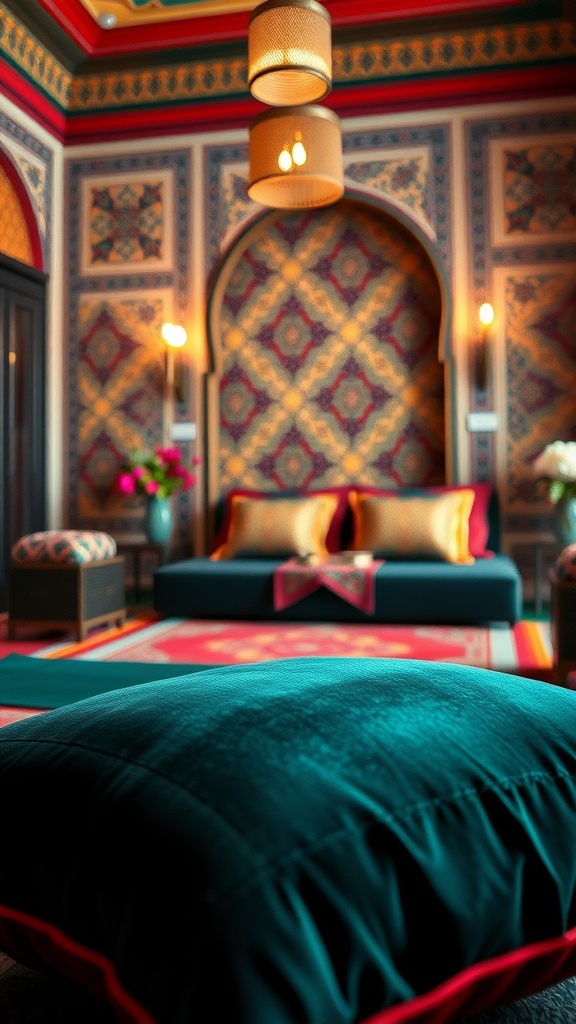 When you think of Moroccan-inspired interiors, vibrant jewel tones often come to mind. This image captures the essence of that style beautifully. The rich colors create a warm and inviting atmosphere, essential for a cozy bedroom. Notice the interplay of deep blues, reds, and golds that are characteristic of Moroccan decor.
