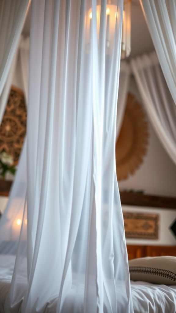 The airy curtains provide privacy while maintaining an open feel, making the bed a perfect retreat for relaxation. You can add touches of Moroccan decor, like vibrant Moroccan rugs or intricate lanterns, to enhance the overall aesthetic. These elements help infuse the room with ethnic patterns and colors, making it a beautiful sanctuary.