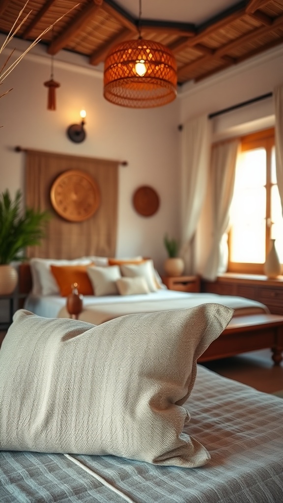 The woven pendant light adds a unique flair, enhancing the bohemian vibe. It perfectly complements the soft, neutral tones of the bedding and decor. You can easily incorporate elements like Moroccan rugs or Moroccan bedroom ideas to elevate the space further.