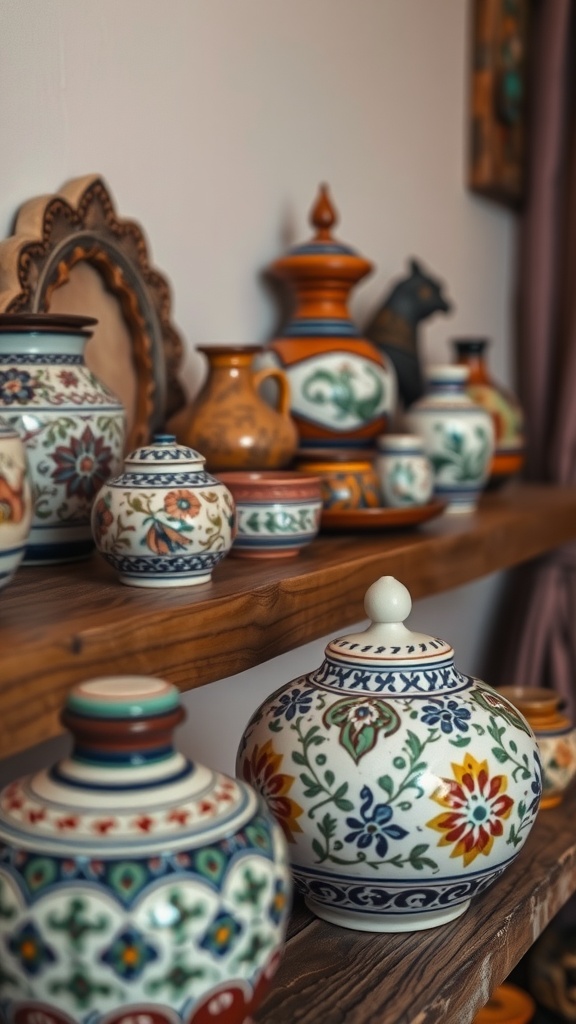 Displaying these unique ceramics on a rustic wooden shelf creates a perfect contrast. The earthy tones of the wood harmonize beautifully with the vibrant ethnic patterns found in Moroccan decor. This combination is a great way to integrate a bohemian vibe into your personal sanctuary.