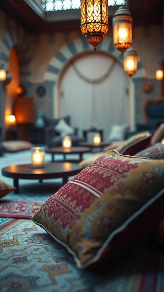 The intricate ethnic patterns on the walls and the lantern decor add depth and texture to the space. Moroccan lanterns hanging from the ceiling not only light up the room but also contribute to the overall aesthetic, creating a magical ambiance.
