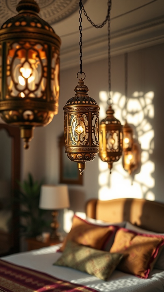 Moroccan rugs can also play a huge role in pulling the room together. They add an extra layer of texture while echoing the colorful accents found in the bedding. Incorporating lantern decor, like the hanging piece in the image, enhances the overall ambiance, giving a magical touch to the space.