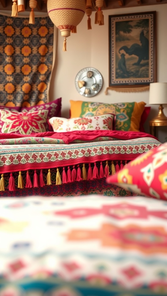 When it comes to Moroccan-inspired interiors, vibrant textiles are key. This image showcases a stunning bohemian bedroom filled with rich colors and ethnic patterns. The layered bedding invites you to dive right in, making the space feel warm and cozy.