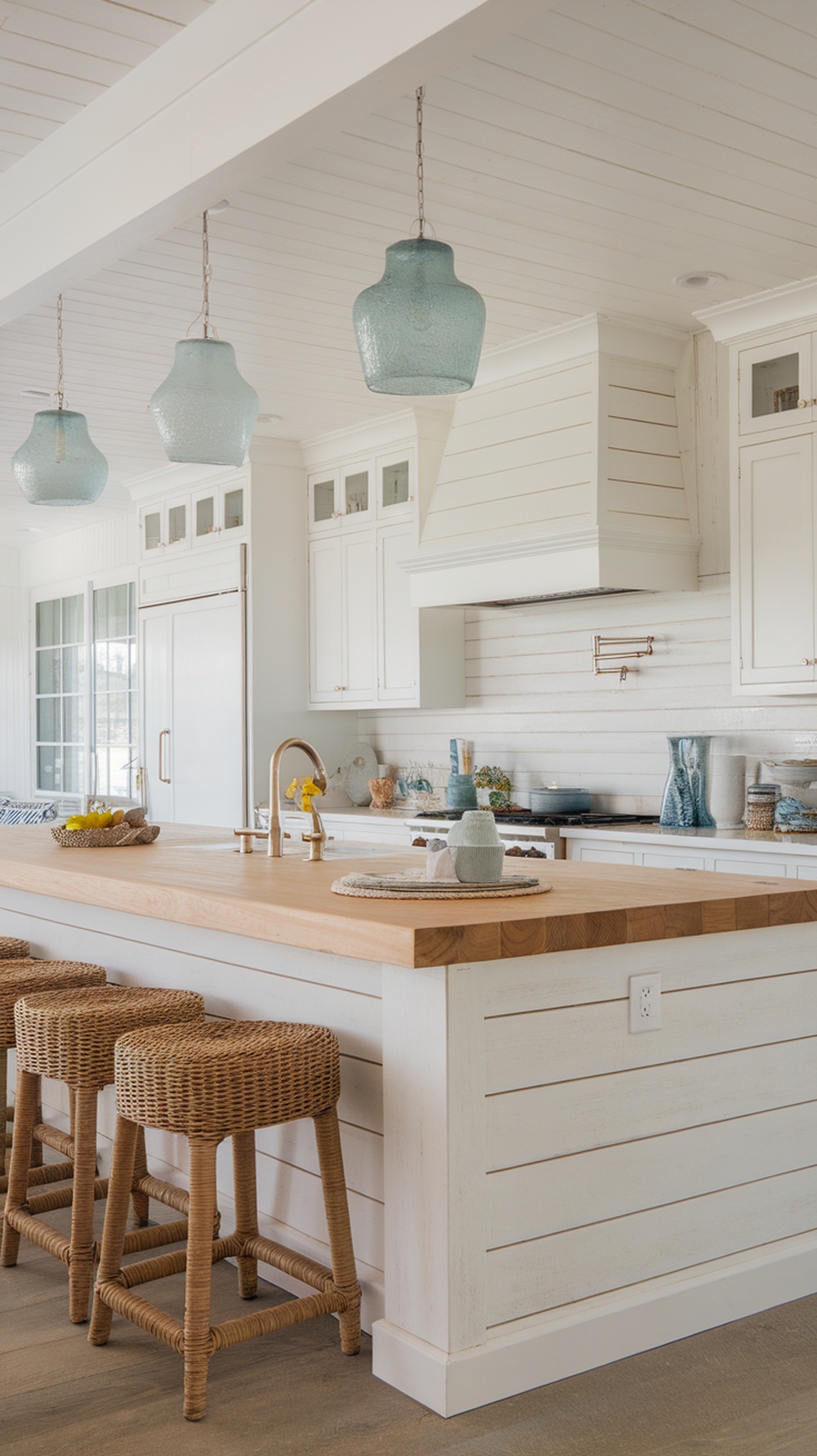 This kitchen island brings a refreshing coastal vibe into your home. The light wood top paired with white shiplap walls creates a bright and airy feel. It’s perfect for anyone who loves a beachy aesthetic.
