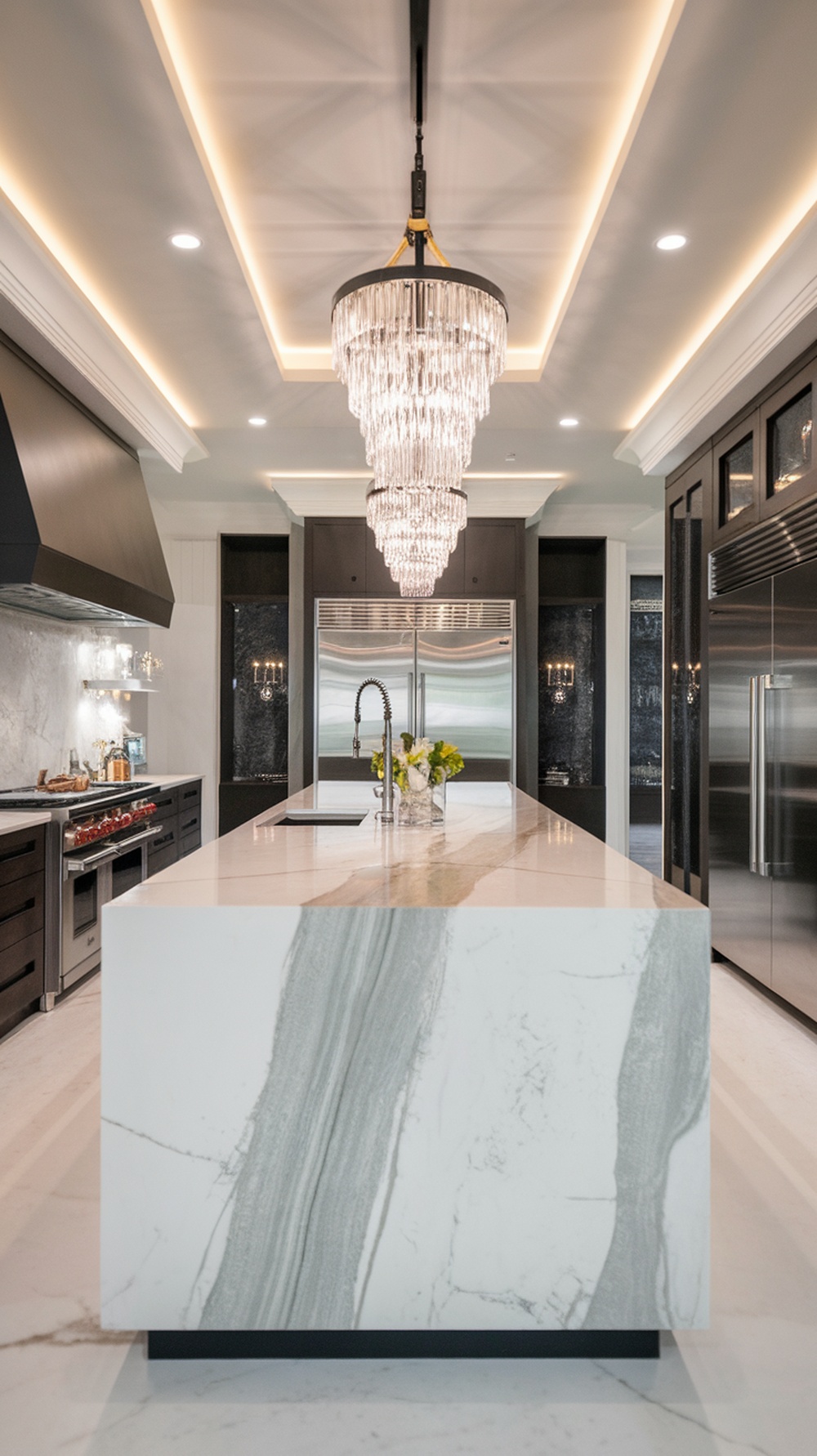 To enhance the elegance, a stunning chandelier hangs above, bringing a touch of glamour. This lighting choice complements the marble and adds a layer of sophistication to the space. It’s a perfect scenario for hosting gatherings, making this kitchen ideal for both cooking and entertaining.