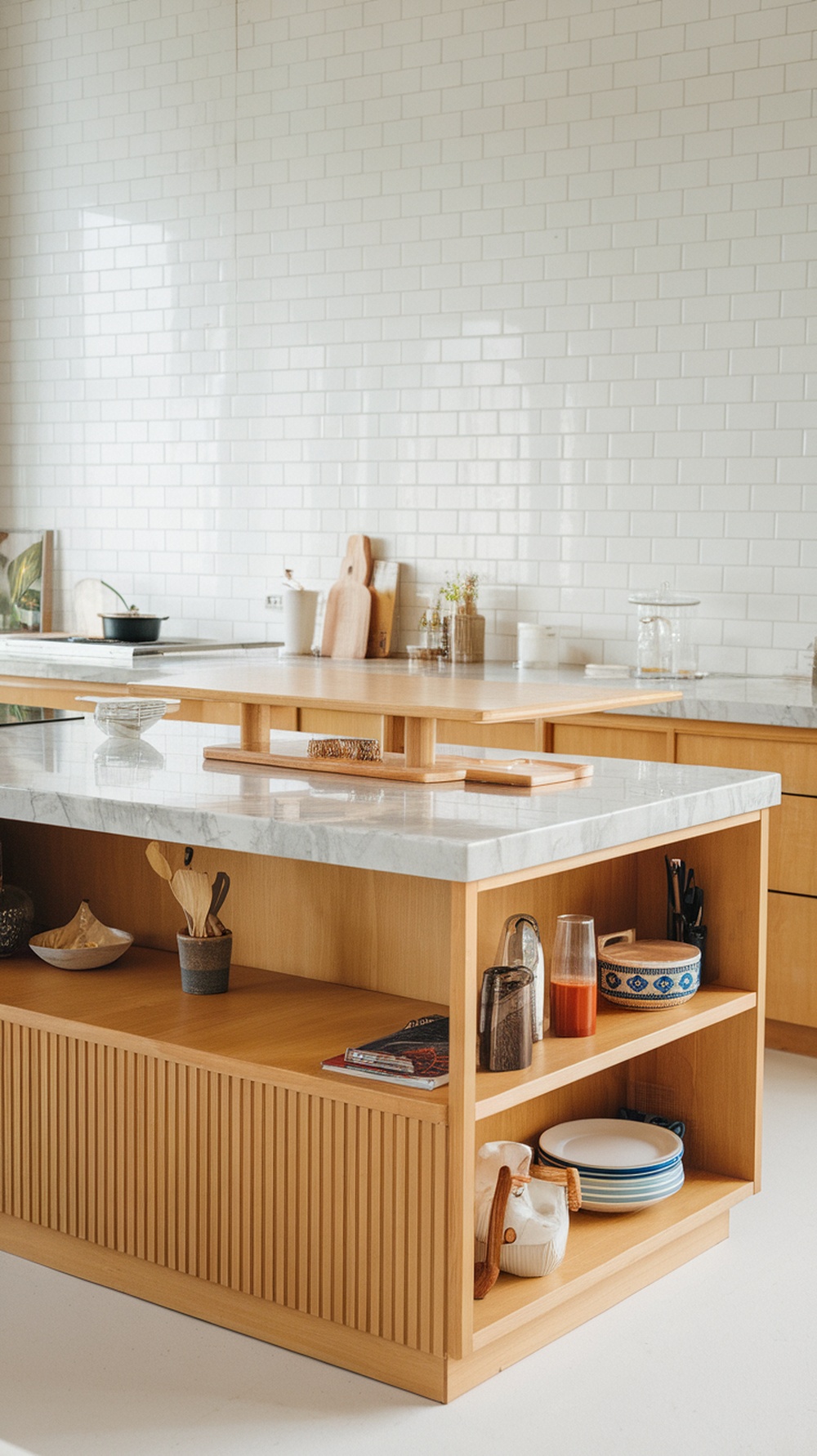 The kitchen island in this image showcases a sleek, multi-level workstation that brings both style and functionality to your cooking space. The combination of wood and marble creates a warm yet modern feel, perfect for contemporary homes.